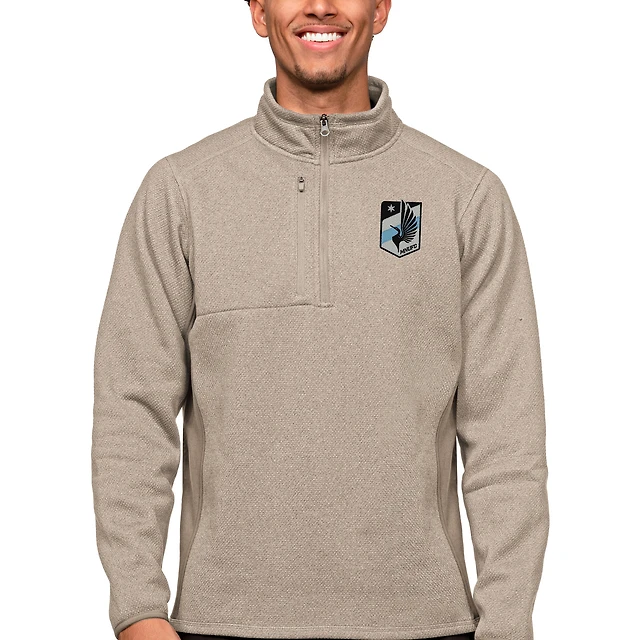 Men's Antigua Oatmeal Minnesota United FC Primary Team Logo Course Quarter-Zip Pullover Top