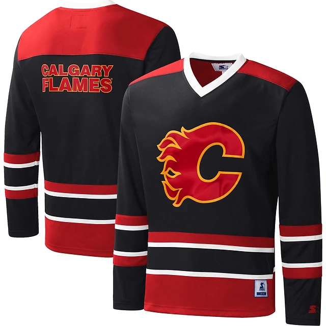 Men's Starter Black Calgary Flames Cross-Check V-Neck - Long Sleeve T-Shirt