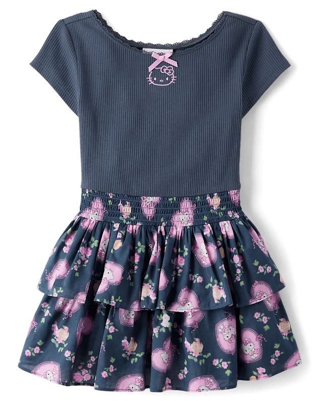 Girls Hello Kitty® Embroidered Tiered Fit And Flare Dress