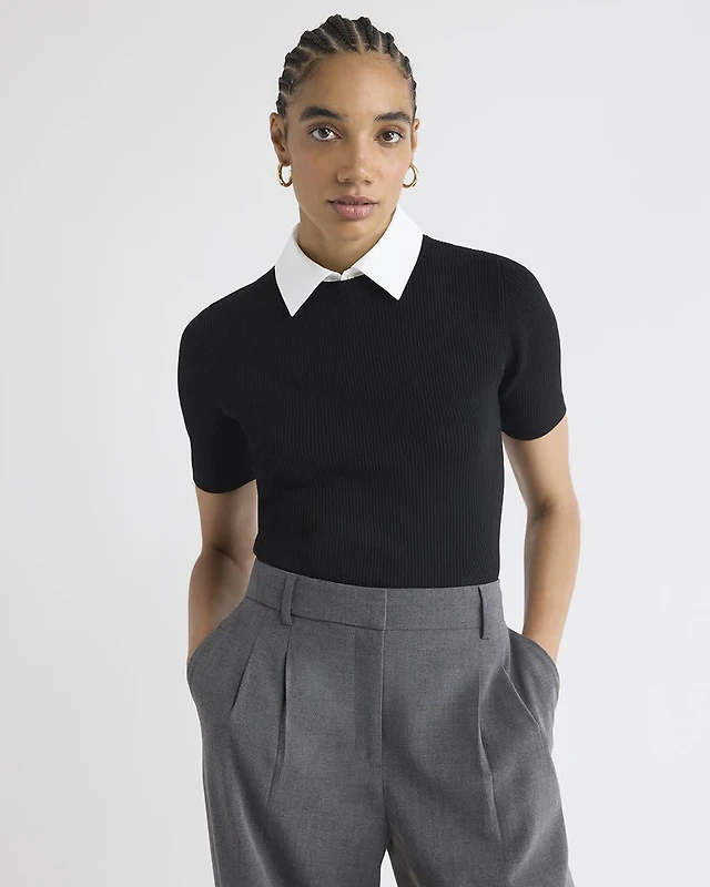 Elbow-Sleeve Ribbed Sweater with Removable Shirt Collar