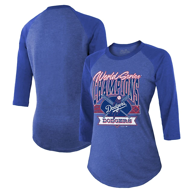 Women's Majestic Threads Royal Los Angeles Dodgers 2025 World Series Champions Play The Field Tri-Blend Raglan 3/4-Sleeve T-Shirt
