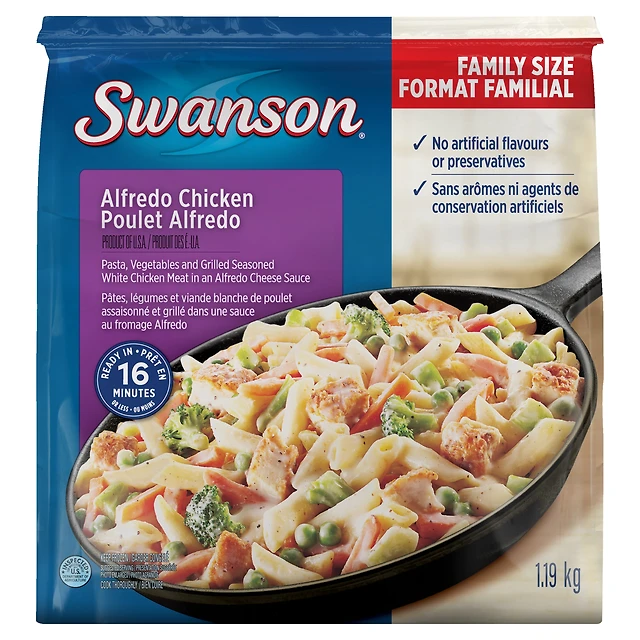 Swanson Alfredo Chicken: frozen meal with pasta, vegetables, and grilled seasoned chicken in an alfredo sauce, 1.19 Kg