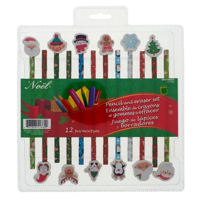 12PK of Christmas pencils with matching erasers
