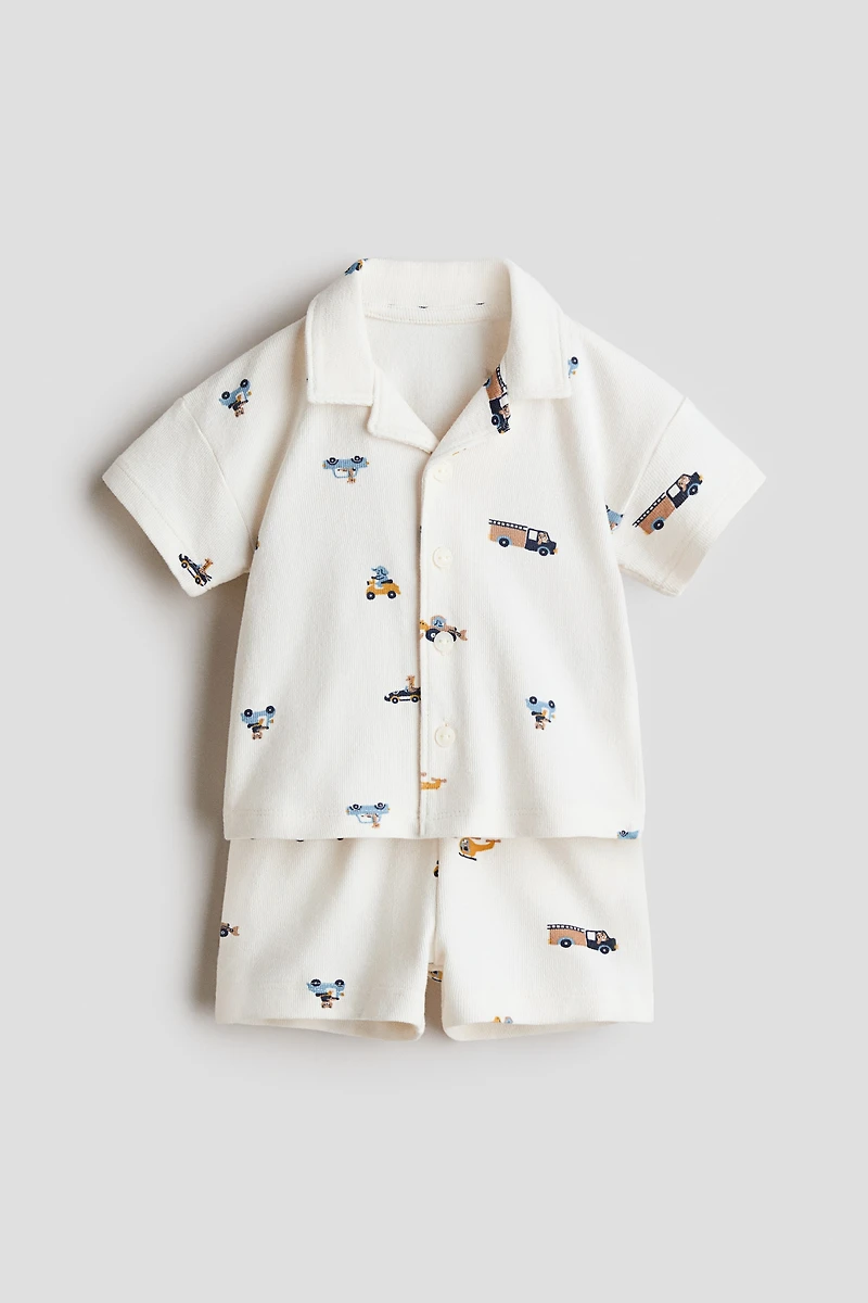 Set in soft, lightweight cotton terry with a resort shirt and shorts. Short-sleeved shirt with a resort collar, dropped shoulders, and buttons at front. Shorts with an elasticized, drawstring waistband.
