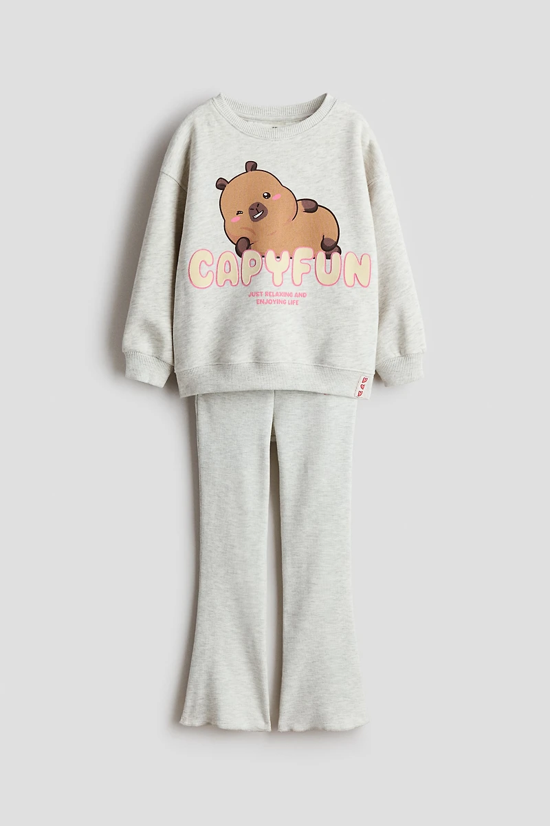Set with a sweatshirt and coordinated leggings, both with a printed motif at front. Sweatshirt with a soft brushed inside, round neckline, heavily dropped shoulders, long sleeves, and ribbing at neckline, cuffs, and hem. Leggings in ribbed jersey with a concealed, elasticized waistband and flared legs with overlocked hems.
