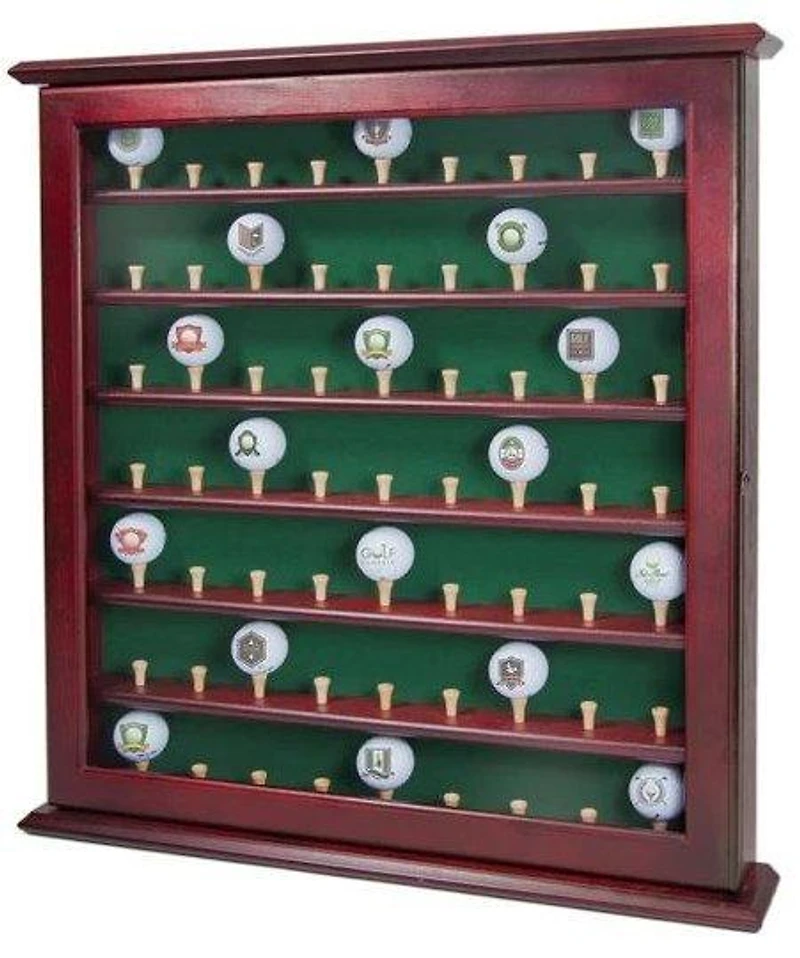 Elevate the presentation of your golf collection with the Executive 63 Golf Ball Display Cabinet. Crafted with elegance, this mahogany-stained wooden cabinet showcases up to 63 collectible golf balls on individual tees against a backdrop of lush green felt. The clear acrylic door protects your treasures while allowing for easy viewing. Designed to complement any home or office decor, this display cabinet includes a wall mounting bracket for secure installation. Whether for yourself or as a thoughtful gift for the golf enthusiast in your life, this display cabinet turns your collection into an artful exhibit.