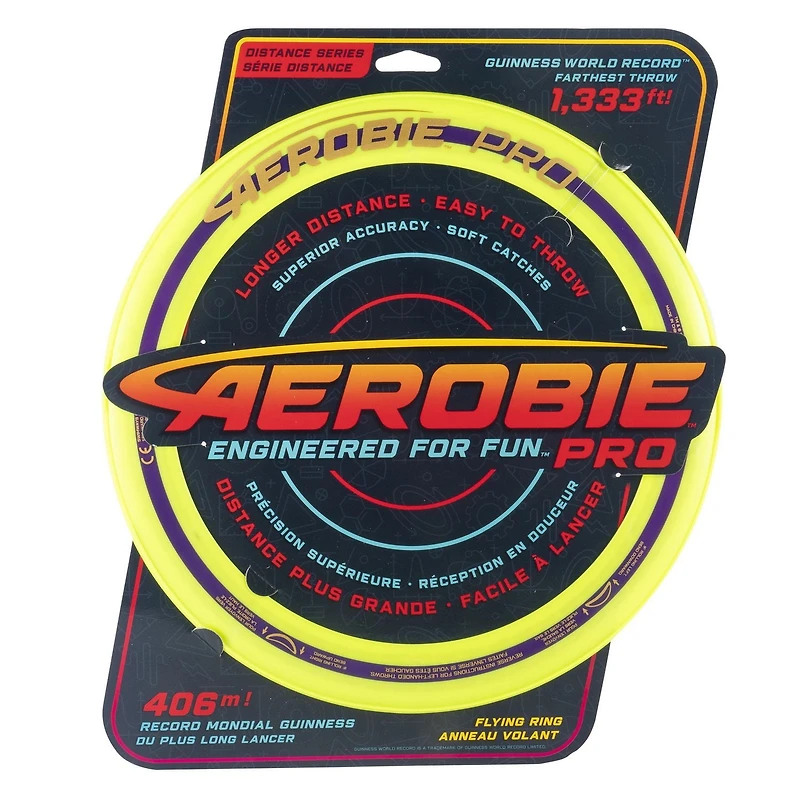 For exhilarating flying disc games, nothing compares with the high performance of the Aerobie Pro Ring. This flying disc was used to set a world record for the farthest throw, an amazing 1,333 feet (406 meters)! The thin design of this 14-inch flying ring allows the disc to travel longer distances and features soft edges for comfortable catches. The open center allows each player to personalize their throwing and catching style – catch the edge with your hand or use the center to catch it with your arm or foot. Create your signature moves with Aerobie flying discs! The Aerobie Pro Ring measures 13 inches in diameter. Available in assorted colors. Sold individually. Note: This disc does not float in water. Ages 12+.