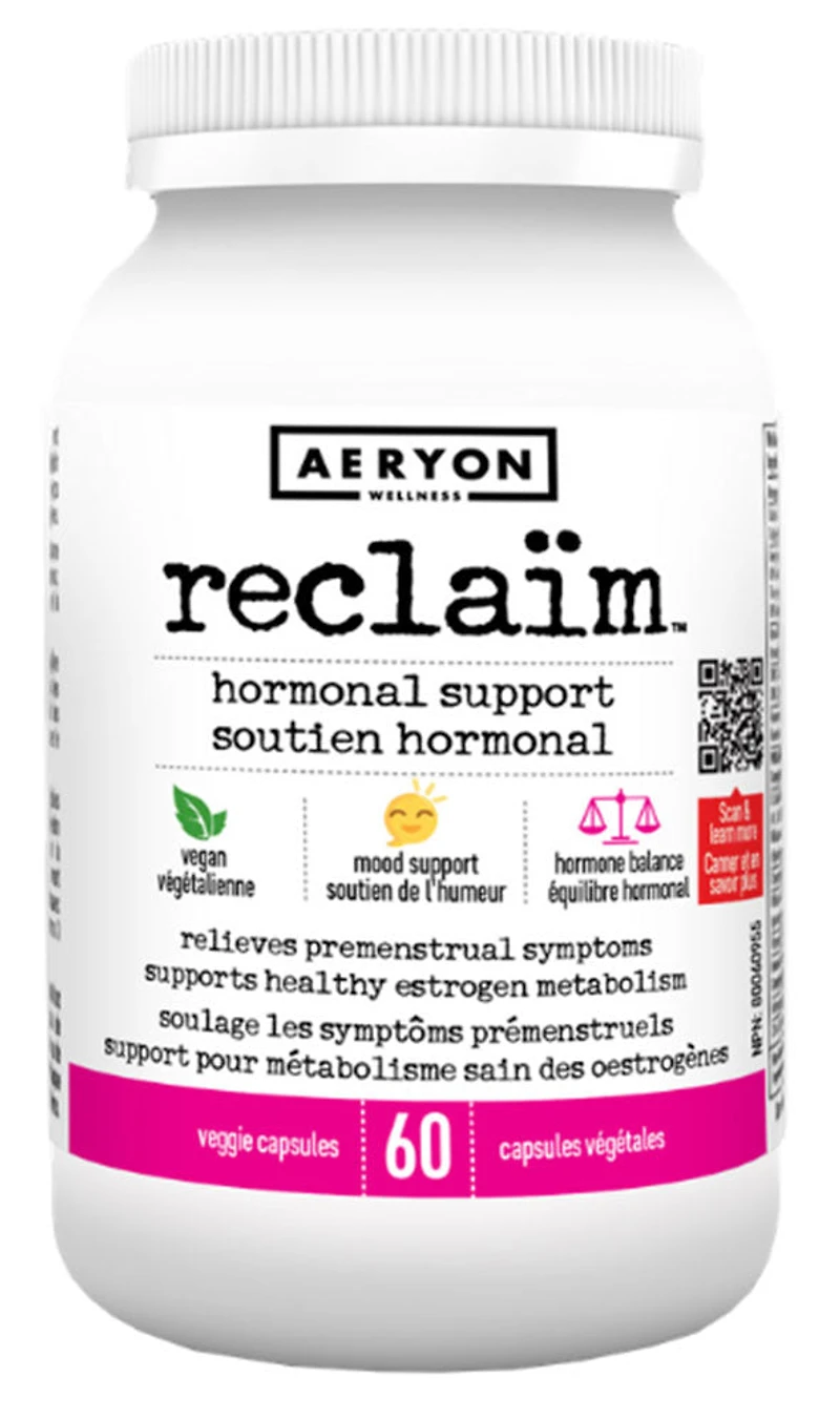 AERYON WELLNESS - Reclaim - 60 veggie Capsules - NPN : 80097288 Reclaim is scientifically formulated to support healthy estrogen metabolism. This formula promotes healthy mood, stabilizes menstrual cycle irregularities, maintains immune function, healthy skin and provides antioxidants.