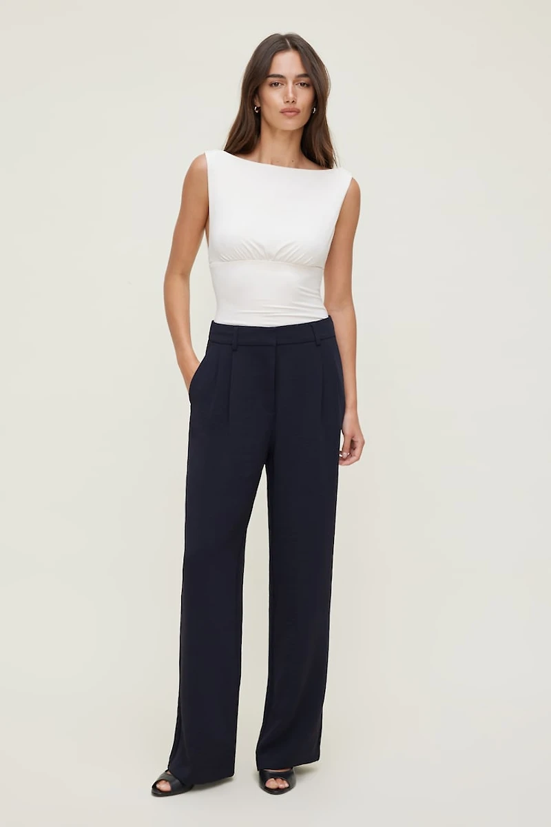 These pants are made from airflow—our flowy and lightweight crepe fabric with a subtle crinkle for a cool, polished feel. They're designed to sit high at your waist with a relaxed seat that flows into a draped wide leg. With pleated detailing, these
