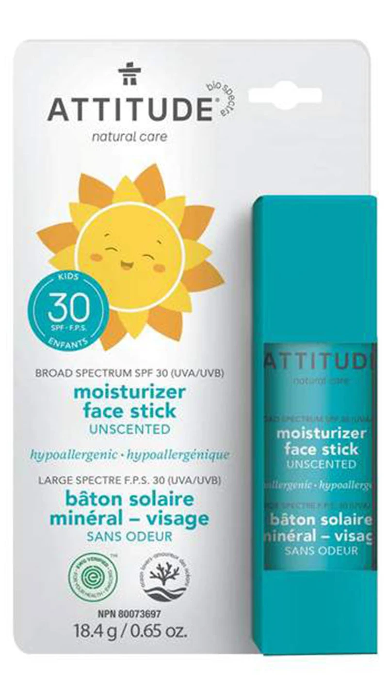 DescriptionAttitude - SPF30 Baby Face Stick - 18.4 18 gr Grams - NPN: 80073697 -- We chose the perfect size zinc oxide molecule to get a fine balance between safety and functionality. Our 100% Mineral Face Stick crafted with non-nano zinc oxide contains 100% of natural ingredients. It is transparent, while offering the SPF 30 protection against UVA and UVB sunlight you need, for the safest sun care possible. Our Top-rated EWG VERIFIED mineral sunscreen stick for the face is the perfect worry-free solution for kids, and even grown-ups on the go! Mineral sunscreen made with 100% non-nano zinc oxide, safest option according to EWG experts. Ecologo Certified: Sustainable and Biodegradable sunscreen. All natural ingredients: Plant-based and mineral only 100% vegan. Reef safe sunscreen:INGREDIENTS