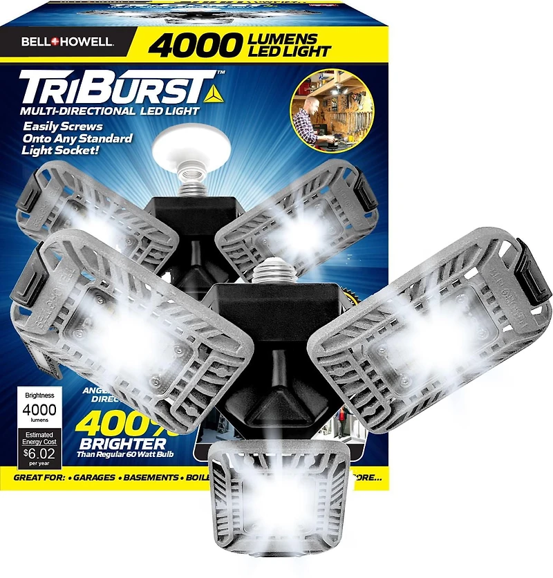 Brighten any space with the Bell + Howell Triburst 4000 Lumens Multi Directional LED Garage and Shop Light. Designed with 144 high-intensity LED bulbs, this fixture easily screws into any standard socket for tool-free installation. Adjustable panels provide 360° lighting coverage while saving energy and producing low heat. Perfect for garages, basements, workshops, attics, and even porches, this LED shop light delivers long-lasting brightness with convenient auto shutoff after 30 seconds or manual control. Durable, efficient, and low-maintenance, it keeps your spaces safer and well lit.