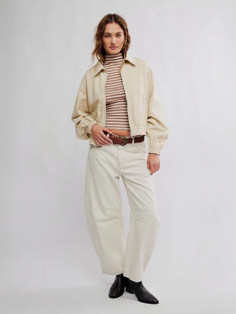 Blending elements of classic track styling and bomber jacket inspiration, the Free People Birdie Track Jacket is an essential layer for any season. Constructed completely from cotton twill, shirred elastic trim and roomy sleeves create a structured silhouette. Slit pockets offer an easy place to stash small items, while a full-length zip closure up front completes the style.  Twill collared jacket Elasticated cuffs and waistband Two front pockets Drop shoulder and balloon sleeve detailing 100% cotton Style no.: OB2222693