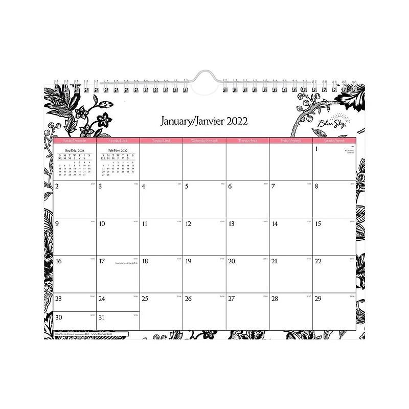 Get a clear picture of each month with the 2022 Blue Sky monthly wall calendar, perfect for home, school, or office. Featuring the classic black and white “Analeis” print, this conveniently-sized calendar delivers sophisticated design and ample writing space.Each new month includes unlined blocks for creative scheduling. The Blue Sky 12-month wall calendar is built for premium durability, with high quality white paper and metallic twin-wire that suits any office décor. A sturdy wire hook ensures easy hanging, but this elegant 2022 yearly calendar looks just as lovely on a desk as it does on any wall.