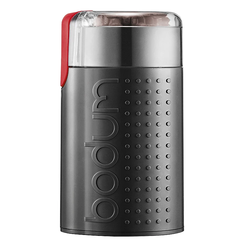 Bring out your inner barista with this black Bodum Bistro coffee grinder. The stainless steel, plastic and rubber materials support long-term use, while a convenient cord storage space in the base helps save space on your kitchen top when not in use. Featuring a transparent lid, this coffee grinder makes it easy to view the grinding progress to achieve your desired coarseness, and a simple push button lets you effortlessly select between pulse or continuous grounding, offering easy operation. The stainless steel blades spinning at a precise rate per minute deliver quick, powerful performance so you can get your cup on. This Bodum Bistro coffee grinder features a neat and compact design for comfortable handling, and the 60g capacity provides an ample supply to push you through the week | Bodum Bistro Coffee Grinder in Black