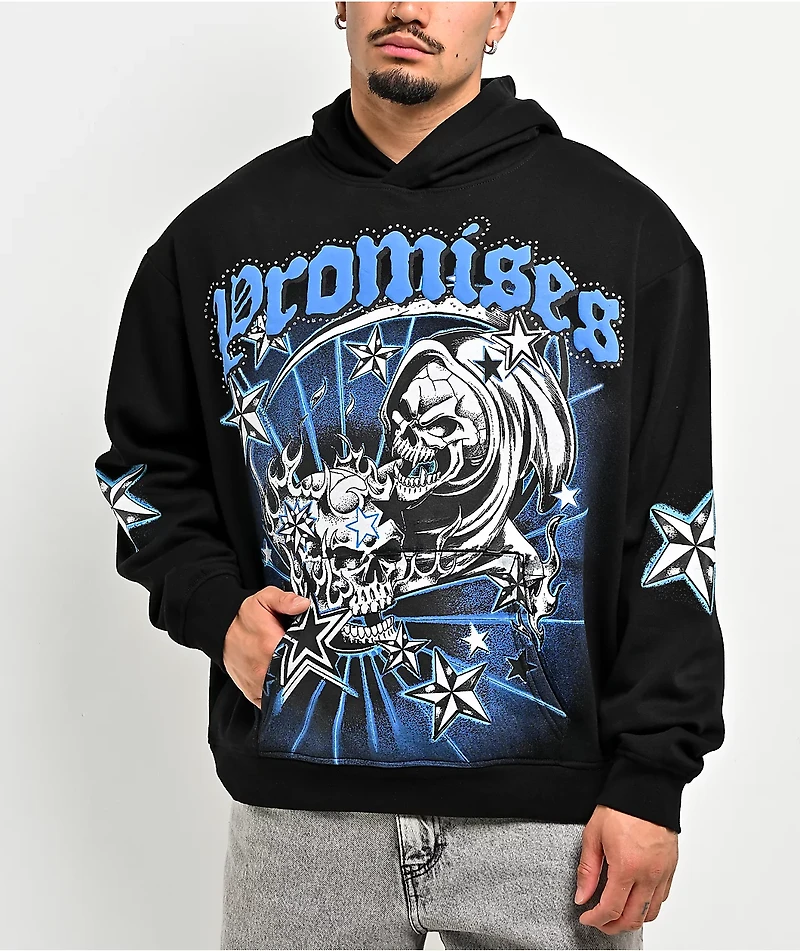 Add an alternative vibe to any outfit with the Nautical Rhinestone hoodie from Broken Promises. The black pullover features nautical star designs throughout, with the front also showcasing artwork of a skeletal grim reaper. Sparkling silver rhineston
