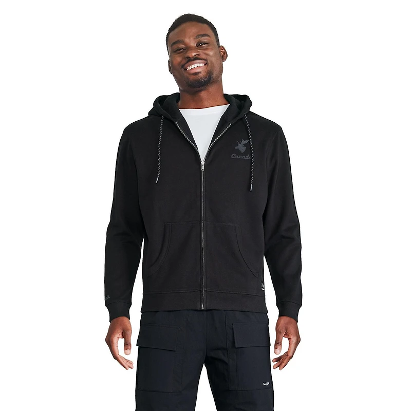 Canadiana adult gender inclusive full-zip hoodie is an extra layer that keeps you looking casual. Made from brushed back fleece, it’s a comfy addition to your wardrobe. The hoodie features a hood with drawcord, long sleeves, a full-zip closure, chest and hood appliques, kangaroo pockets, ribbed cuffs and bottom band, and a straight hem. Perfect for layering over any tee in your closet, this hoodie will become an everyday staple.
