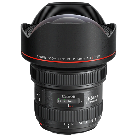 To experience the ultimate in wide-angle photography, the EF 11-24mm f/4L USM brings L-series construction and optics to the widest zoom lens Canon has ever made. With an expansive wide-angle range of 11-24mm, this is an ideal lens for landscapes, interior shots, and unique perspectives on subjects close and far. Its new optical design features Super UD and UD lenses that correct chromatic aberration. Four aspheric lens elements help to minimize distortion from the center of the image to the periphery and throughout the zoom range. A Subwavelength Coating (SWC) and Air Sphere Coating (ASC) significantly reduce flare and ghosting, while a 9-blade circular aperture diaphragm creates beautiful, blurred backgrounds. For silent and fast AF, it features a rear focus system and ring USM, and can be manually focused even when in AF mode. It has a minimum focusing distance of 11 in./0.28m (extreme telephoto) for admirable performance and results even when shooting in tight spaces.