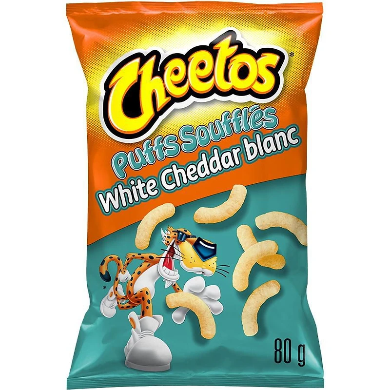 Cheetos Puffs continue to satisfy your need for cheese with a White Cheddar flavour! Use caution when opening this bag! Contents of this bag have been found to be Dangerously Cheesy. One bite of Cheetos Puffs White Cheddar cheese flavoured snacks may lead to the following cheese-crazed behaviour: 1. A joy for all things cheesy! 2. Never-ending thoughts of melt in your mouth cheese taste!These beloved cheese flavoured snacks are always a hit. Admit it, you can’t help but eat Cheetos without licking the signature “CHEETLE” off your fingertips. These melt-in-your mouth puffed cheese flavoured snacks have been a go-to snack for many years. They’re guaranteed to amp up the fun! And you can’t go wrong with the classic, cheesy taste of Cheetos Puffs cheese flavoured snacks — now with a tasty White Cheddar twist!