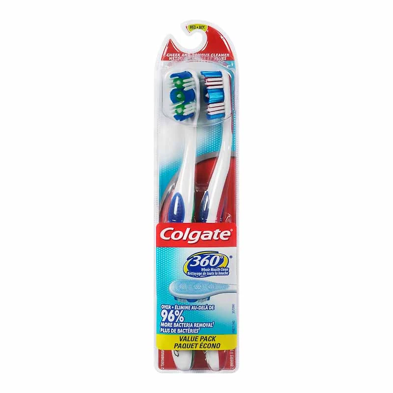Upgrade your brushing routine with this Colgate 360 toothbrush. The cleaning bristles and integrated polishing cups hug your teeth to dislodge and remove tough debris and food particles, while the ergonomic handle sits comfortably in your hand, offering effortless maneuvering to let you reach those hard-to-get areas. Brush after meals to promote optimal oral health habits, Featuring a built-in tongue and cheek cleaner, this Colgate 360 toothbrush helps eliminate bacteria and germs to reduce bad breath for a whole-mouth clean | Colgate 360 Manual Toothbrush - Medium Size 2 Pack