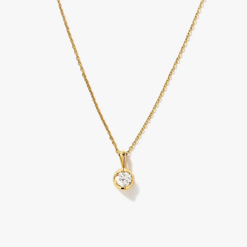 This modern crescent-set necklace is crafted in 14K yellow gold and features a single 0.25-carat round brilliant lab-grown diamond with VS clarity and G colour. The unique faceted setting is designed to catch light from every angle, enhancing the diamond’s radiant sparkle. Lab grown diamonds are chemically, physically,