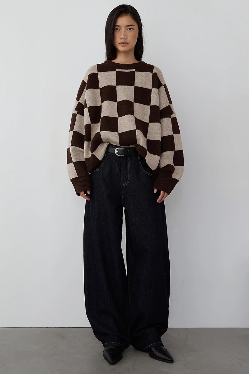 This best-selling checkered sweater is made in an oversized fit with dropped shoulders and ribbed trims. A cozy knitwear choice that goes with anything in your wardrobe, wear it with cargo pants and sneakers. Now available in solid shades to become a wardrobe essential. DETAILS Oversized fit. Checkered knit. Crew neckline. Ribbed trims. Dropped shoulders. FIT & SIZING Oversized fit 25” length based on size S Model in Bitter Chocolate Check is 5'6” and is wearing a size S Model in Heather Oatmeal Check and Evening Blue Solid is 5'7" and is wearing a size S