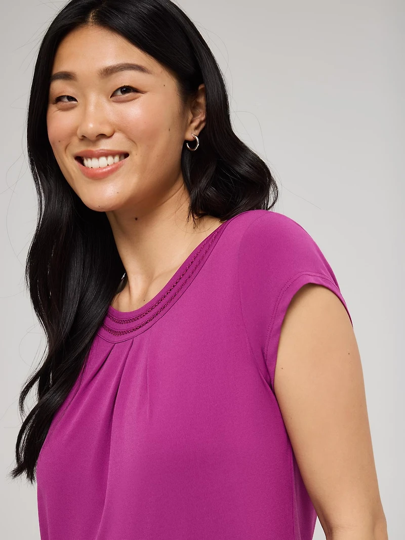 This classic top brings a subtle, feminine twist with delicate crochet detailing around the neckline, adding charm to simple, everyday looks.Knit topCap sleevesSolid stretch JerseyRound neck top with crochet insert at necklinePleat detailsBack keyhole with buttonModel is wearing size XSFabric: 95% polyester, 5% spandexMachine wash in cold waterHang to dry