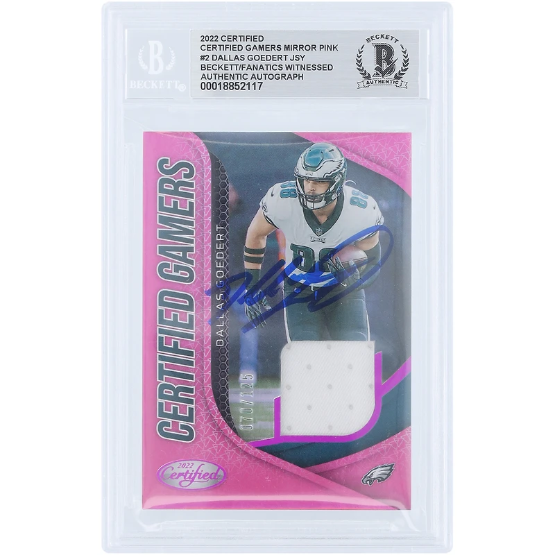 This Dallas Goedert Autographed 2022 Panini Certified Certified Gamers Mirror Pink GU Relic #CG-GD #/125 Beckett Fanatics Witnessed Authenticated Card is ready to help you display your Philadelphia Eagles fandom. Featuring an acrylic case for preservation, it also showcases a bold design and Dallas Goedert's unique signature, making it the ultimate collector's item.