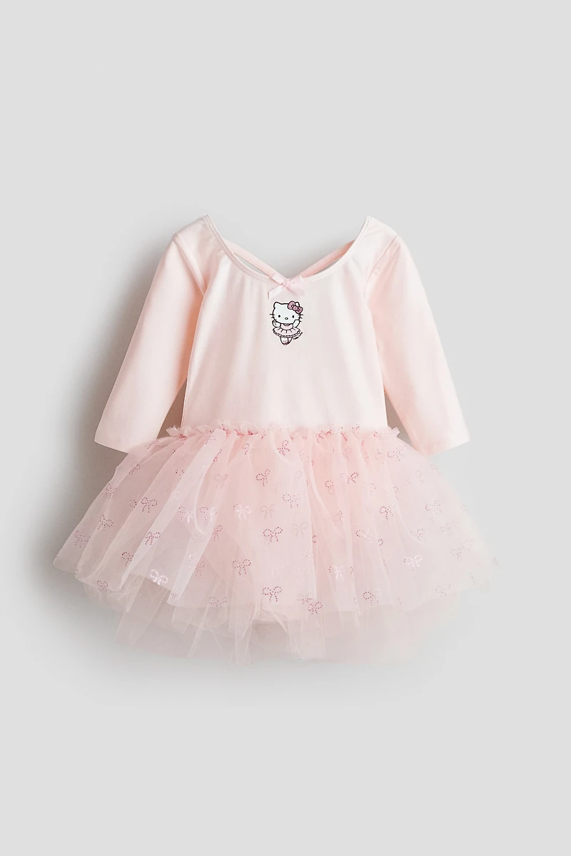 Dance leotard in glossy jersey with a printed design. Crossover straps at back, 3/4-length sleeves, and a gathered, ruffled seam above a triple-layered skirt in glittery tulle.