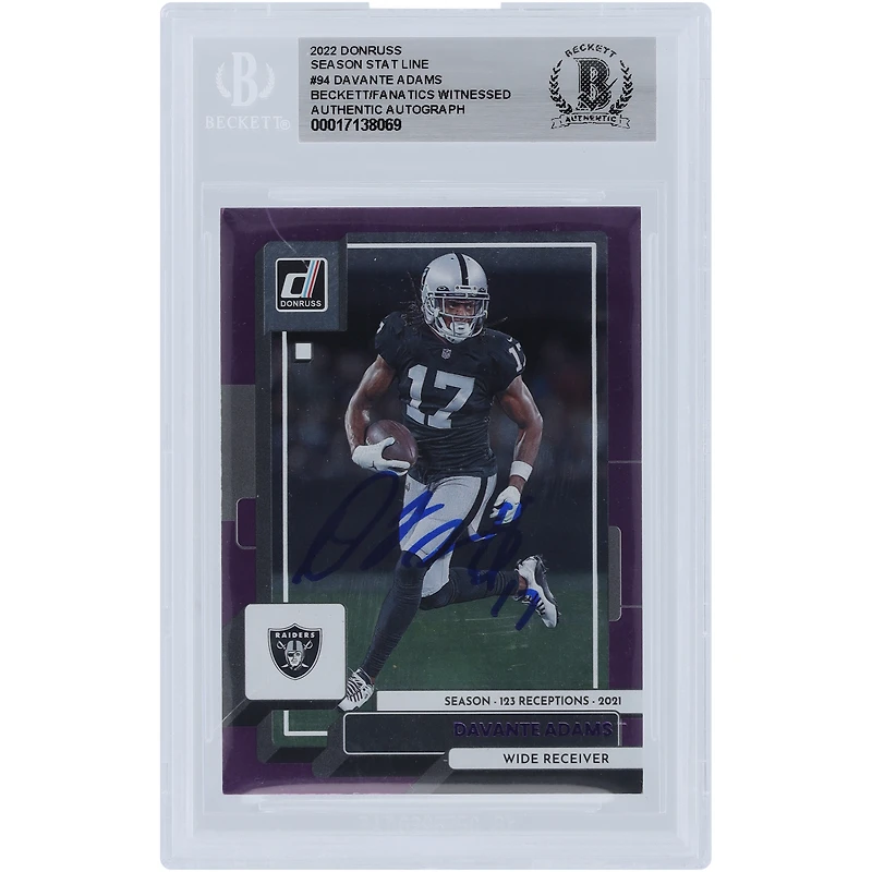 Enhance your Las Vegas Raiders collection with this Davante Adams autographed 2022 Panini Donruss Purple Season Stat Line #94 #/123 Beckett Fanatics Witnessed Authenticated Card. This sought-after card features a hand-signed signature witnessed and authenticated by Beckett and Fanatics, ensuring its authenticity and collectability. Encapsulated in a tamper-proof acrylic case for preservation, this keepsake is the perfect way to commemorate the Las Vegas Raiders superstar.