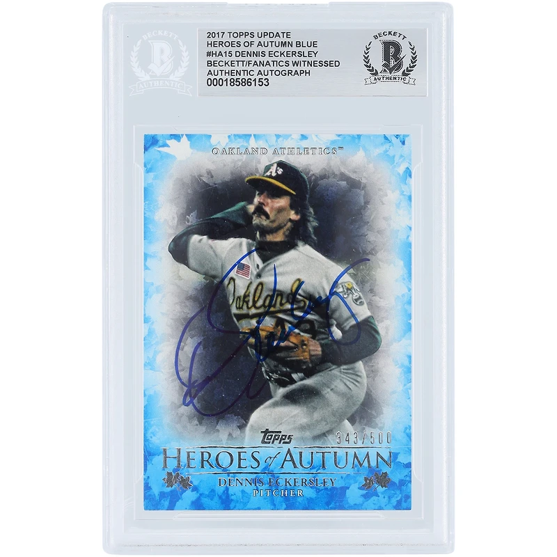 This Dennis Eckersley autographed 2017 Topps Update Heroes of Autumn Blue #HA-15 #/500 Beckett Fanatics Witnessed Authenticated Card is ready to help you display your Oakland Athletics fandom. Featuring a Beckett-certified slab, this collectible also showcases the unique signature of Dennis Eckersley to make it the ultimate collector's item.