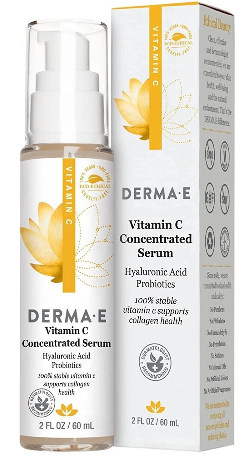 Fast-absorbing, high-potency serum penetrates deeply to deliver antioxidant protection and essential hydration.Vitamin C may brighten the appearance of your skin while retexturizing your complexion.DescriptionDERMA E - Vitamin C Concentrated Formula - 60 Millilitre(s)Our concentrated Vitamin C serum beautifully brightens the appearance of your skin. Dermatologist recommended and clinically proven, this serum is formulated with a stabilized form of Vitamin C, Stay C-50®. This allows the product to work more effectively than non-stabilized forms of vitamin C which can easily degrade and lose potency, diminishing their benefits even before applying.Combining Stay C-50® Vitamin C with powerful antioxidants and nature's moisture magnet, Hyaluronic Acid, our affordable vitamin c serum leaves skin looking brighter, more even, and smooth.INGREDIENTSVitamin C: A potent antioxidant with skin-brightening and anti-aging properties that may help support collagen health.