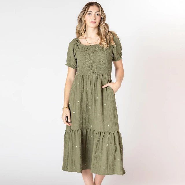 Devoted short puffed sleeve calf length tiered dress, Calf length tiered dress