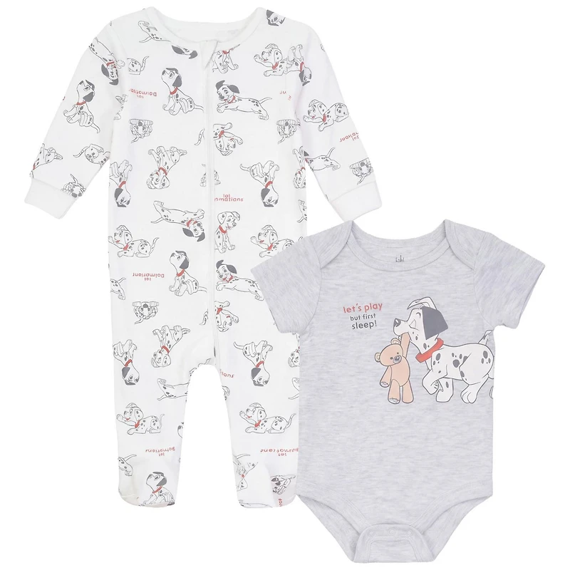 Disney Dalmatians 2-piece Take Me Home set. A cute and comfortable set that will quickly become an essential in baby's wardrobe. Set includes sleeper and bodysuit. Long sleeve sleeper with ribbed neckline and arm cuffs. Front zipper opening for easy dressing and diaper change. Short sleeve bodysuit with lapped shoulders and bottom snaps opening for easy changes. Made from breathable cotton, ensuring lasting comfort.