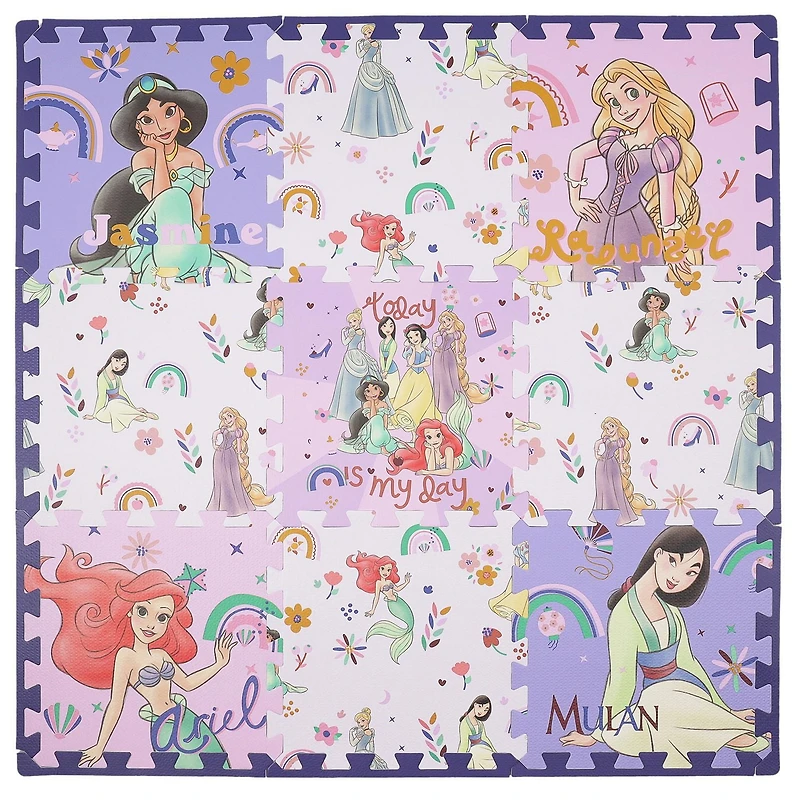 Make playtime feel like a fairytale with Disney Princess Active Flooring. This reversible floor tile set has a super cute Disney Princess design on one side and a cool solid color design on the other. Made from durable, soft, and non-slip EVA foam, these flooring tiles will allow you to create a clean, padded play area in any room of your home. They are lightweight, and fit in a compact carrying case, which makes transport and storage easy. This play flooring set comes with interlocking border pieces, and can be combined with additional sets for increased floor coverage.