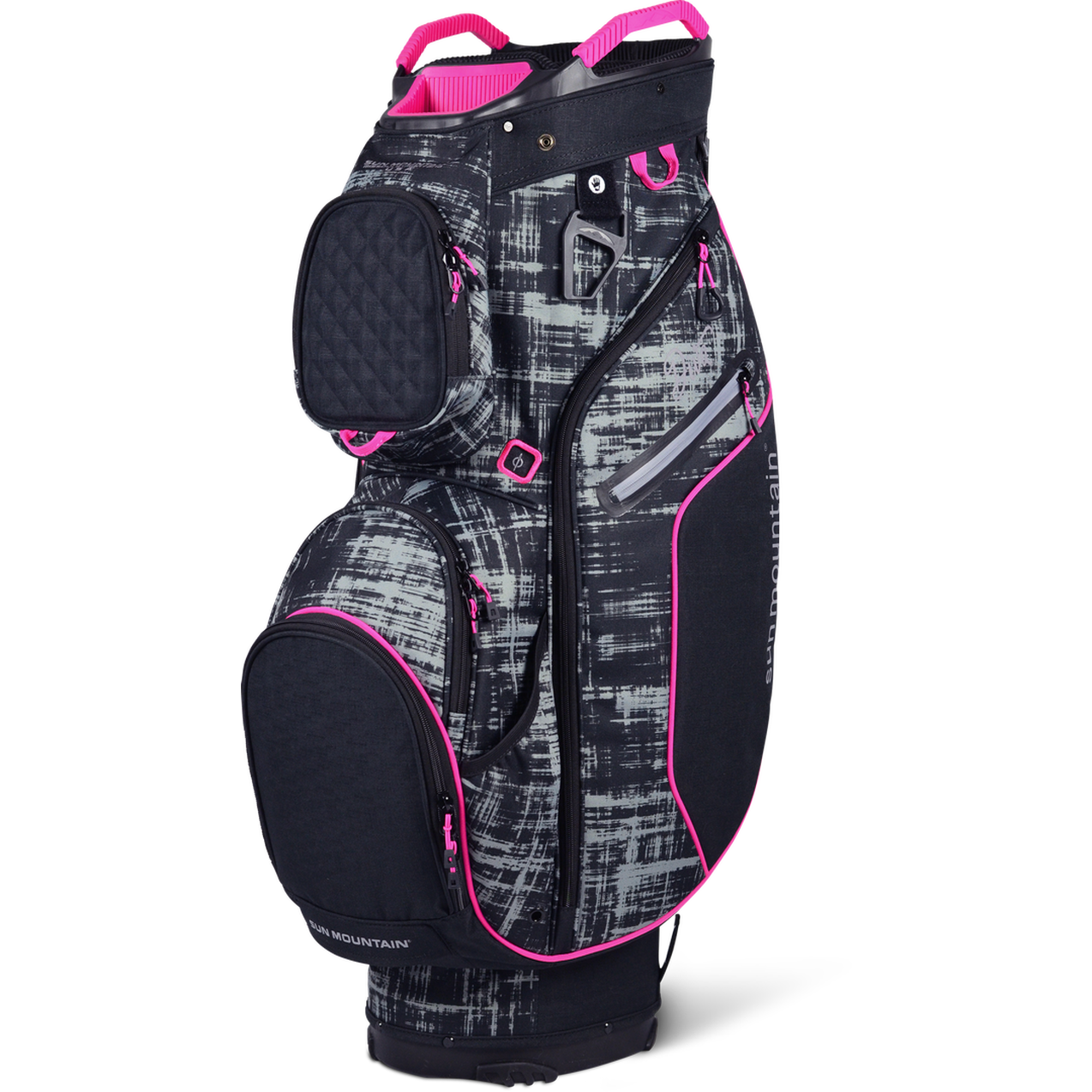 Among the ten pockets are a full-length apparel pocket, a ventilated beverage pocket, a range finder pocket, and a water-resistant, velour-lined valuables pocket.