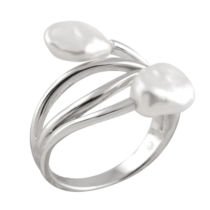 Fancy sterling silver rhodium plated ring with 8½-9mm Keshi freshwater pearls.
