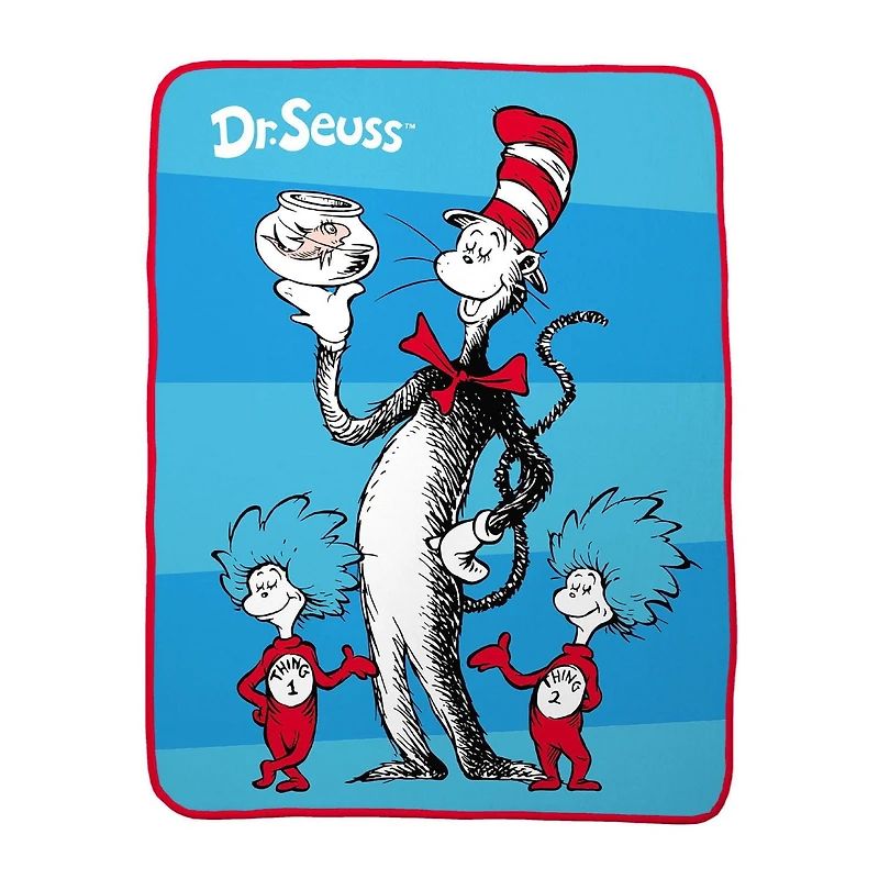 CAT IN THE HAT DESIGN: Mischievous Cat in the Hat, Thing One and Thing Two bring the fun and excitement of Dr. Seuss’ Cat in the Hat home with this cute plush throw. The fun design captures the colorful energy of this fun classic story!•SOFT PLUSH & SUPER COZY: Young Dr. Seuss fans can feel cozy and safe wrapped up in this soft plush micro raschel throw featuring their favorite Cat. The cozy high-quality material keeps kids warm and comfy as they snuggle up for rest or relaxation.•FUN FOR ANY OCCASION: Crafted for comfort, this playful throw will instantly become a bedtime favorite. The lightweight and easy to carry throw is the perfect companion for comfy sleepovers, daycare, camping, traveling, playing, napping and cuddling.•EASY CARE: Throw can be tossed into the washer and dryer without worrying about the colorful themed pattern and animated cartoon characters fading or the need for ironing. The material is wrinkle-resistant making it a great choice for and child's bedroom, playroom or nursery as a home decor accessory.•Super soft throw measuring 46" (W) x 60" (L). Perfectly sized to snuggle-up on the sofa at naptime for children or toddlers while traveling.