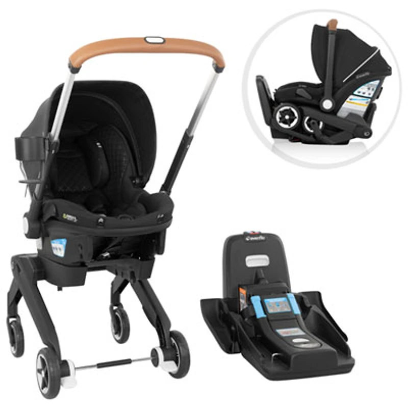 Easily transition from car seat to stroller with the Evenflo Shyft DualRide Infant Car Seat Stroller Combo. Move effortlessly from car to sidewalk in one simple step with wheels that deploy and retract. Features a high-riding seat design, integrated SensorSafe technology, and extended UPF 50+ canopy. | Evenflo Shyft DualRide with Carryall Storage Infant Car Seat & Extended Canopy - Jasper Black