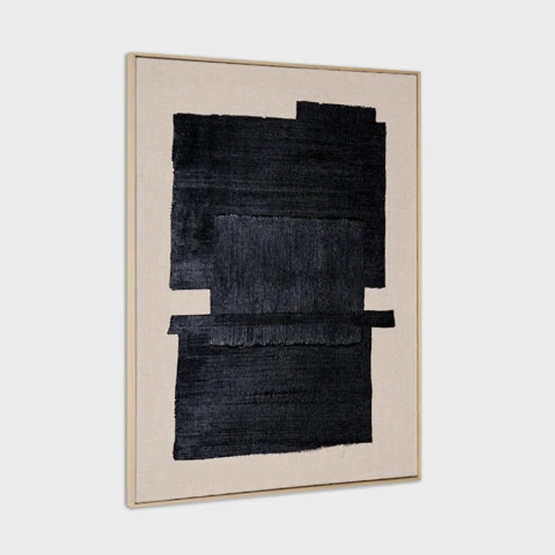 This wall art features a striking abstract design with bold, black geometric shapes layered over a natural linen background. The hand-painted texture adds depth and character to the piece, creating a sense of sophistication and modernity. The contrast between the dark shapes and the light linen fabric evokes a feeling of balance and harmony, making it an eye-catching addition to any space.