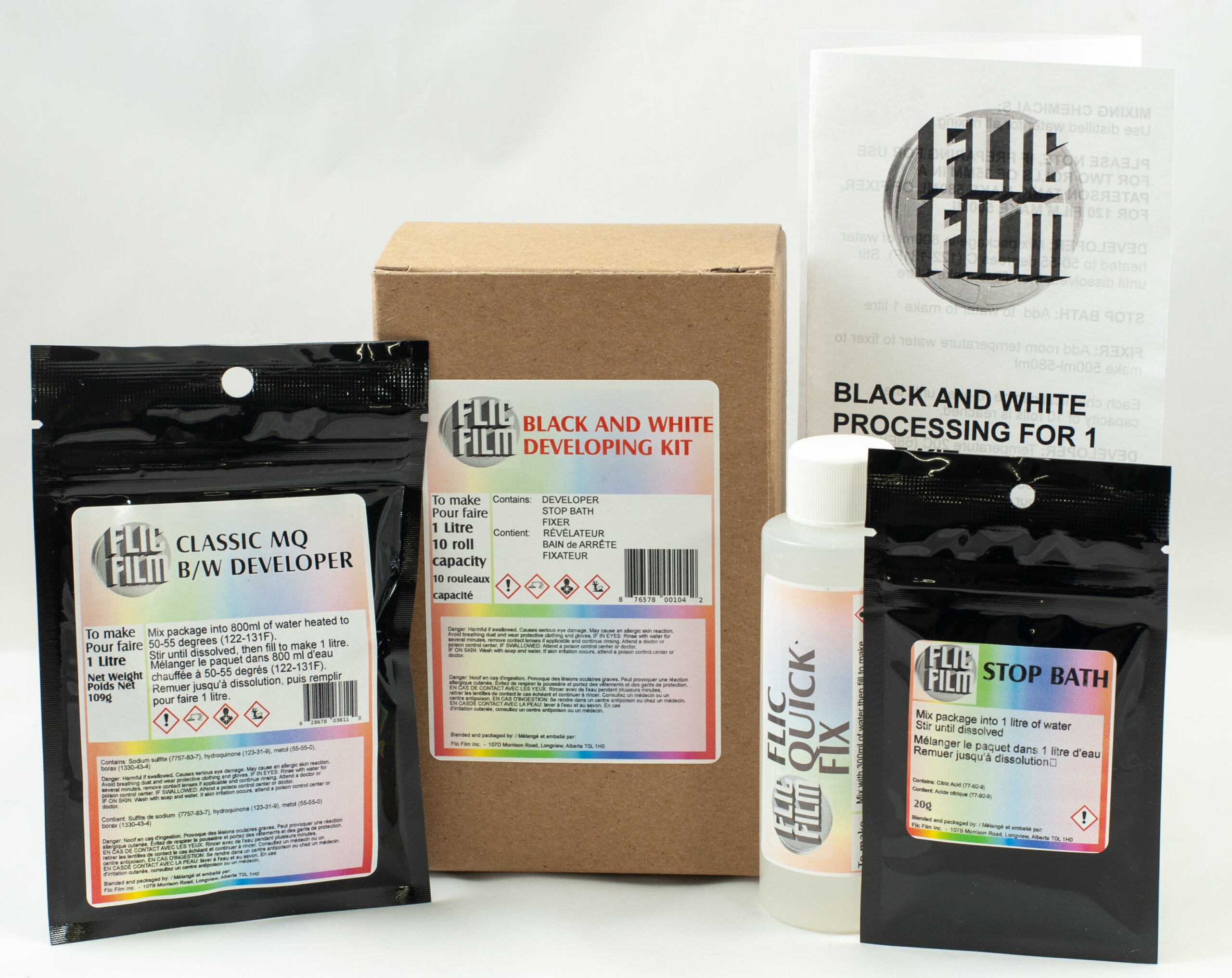 This is a complete kit including Classic MQ Developer, Low Odor Stop Bath and Flic Quick Fixer. The kit also comes with explicit instructions of how to develop black and white film and a chart of development times for most current black and white films. Each kit will develop 10 rolls of 35mm or 120 film