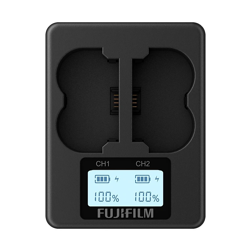 Ensure your Fuji digital camera always has a spare source of power with this Fujifilm battery charger. The dual docks let you charge two batteries simultaneously, and the compact size fits neatly in a camera gear bag for convenient storage. A brightly lit display panel shows the current charging status of each battery, so you know when they are fully powered up and ready for use. This black Fujifilm battery charger works with Fuji NP-W235 batteries for dependable performance | Fujifilm BC-W235 Battery Charger in Black
