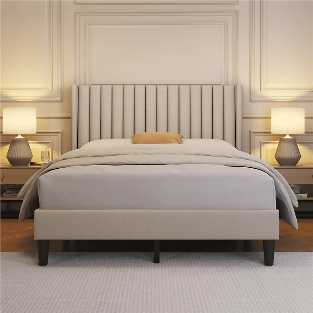 Fullfurnique Upholstered Bed Frame with Wing Side and Channel Headboard, Queen, Ivory