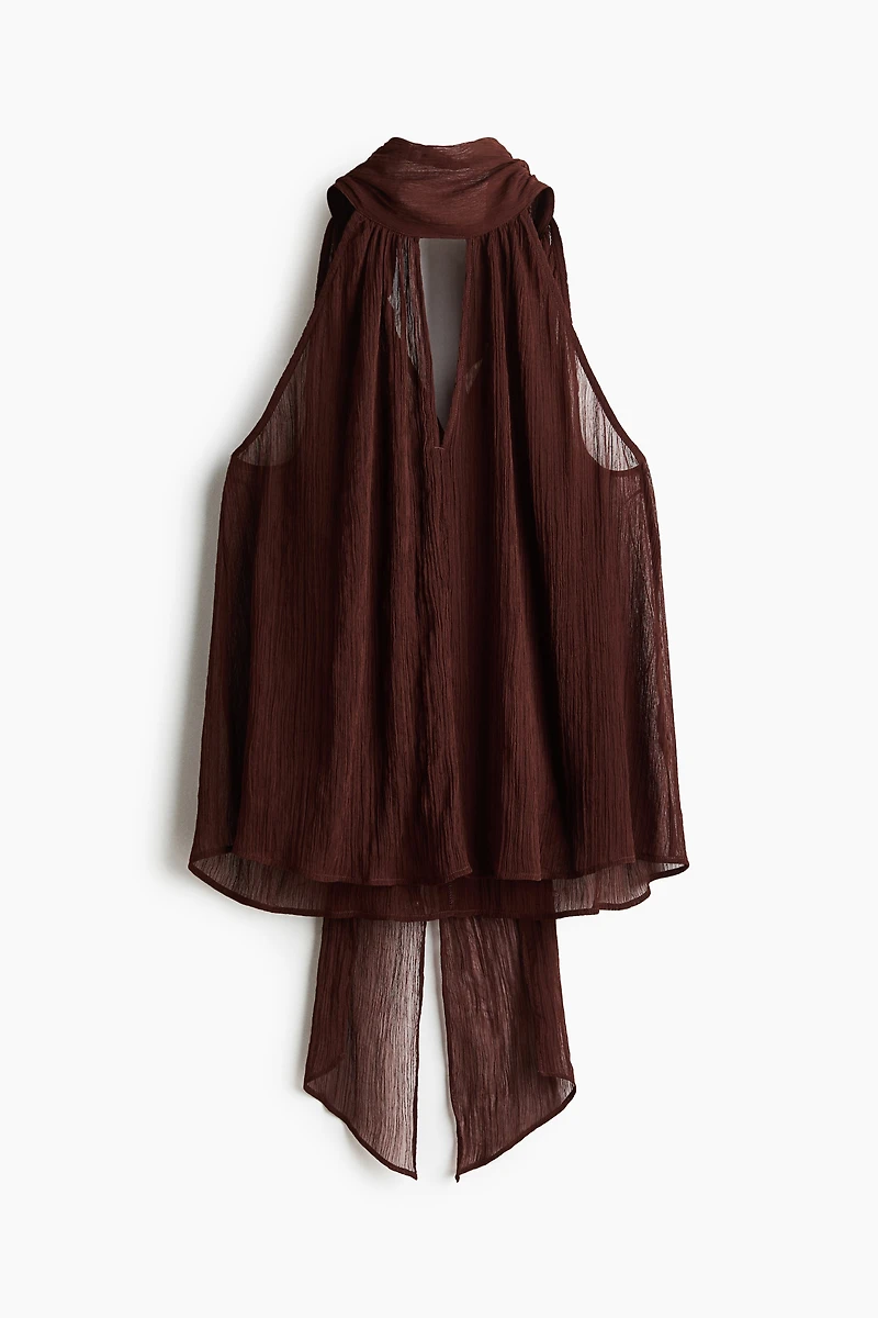 Loose-fit top in sheer, crinkled chiffon. Narrow cut at top, gathered scarf collar, and V-shaped openings at front and back. Unlined.