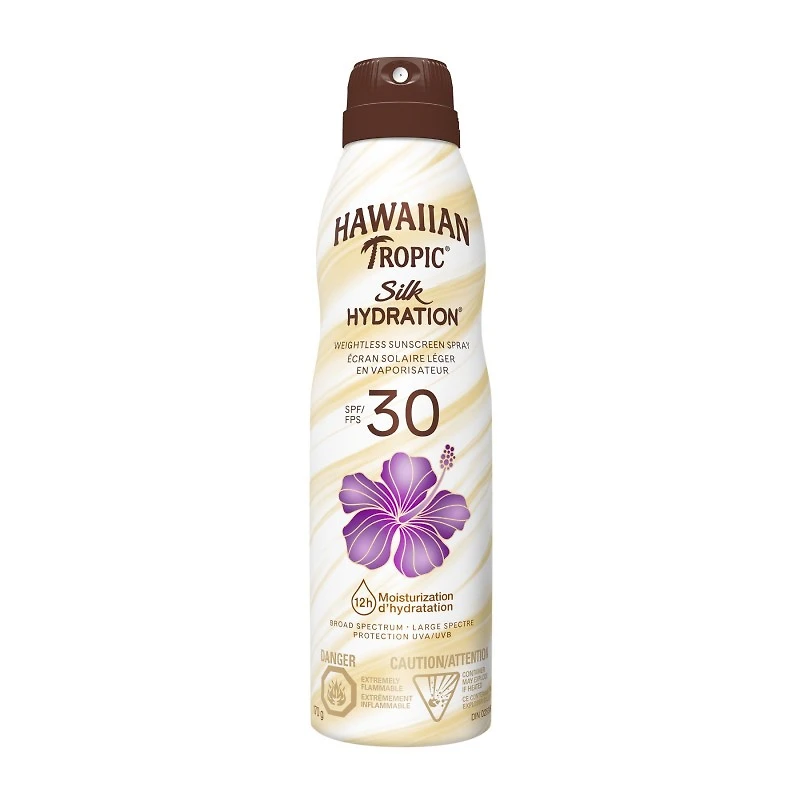 Broad spectrum UVA and UVB protection. 12-hour moisturization. Alluring tropical scent. Exotic tropical botanicals. Easy application and goes on clear. Feels indulgent on the skin as if it barely on Let your senses drift off to paradise as your skin is bathed in the 12-hour hydration of Hawaiian Tropic Silk Hydration Weightless Clear Spray. The easy spray application keeps your skin glowing and soft, and provides broad spectrum UVA and UVB protection | Hawaiian Tropic Silk Hydration Weightless Clear Sunscreen Spray - SPF30 Size 170g