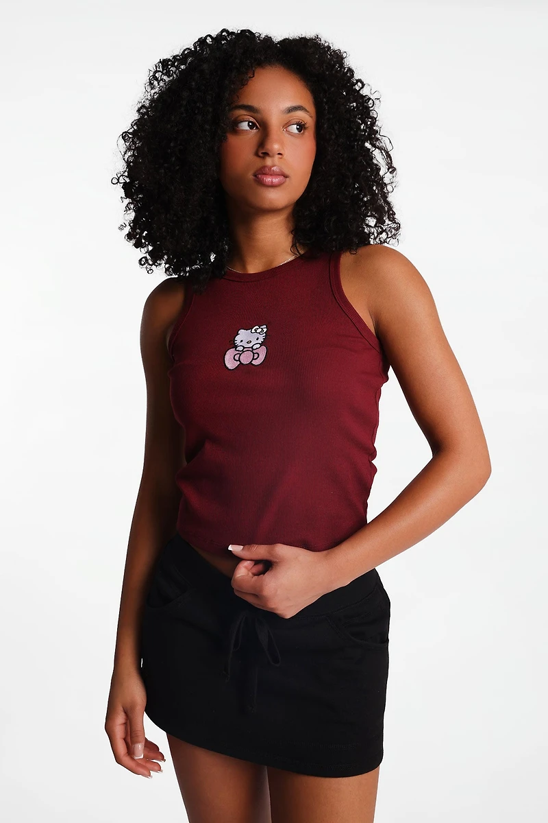 Hello Kitty Bow Embroidered Patch Graphic Ribbed Tank Top