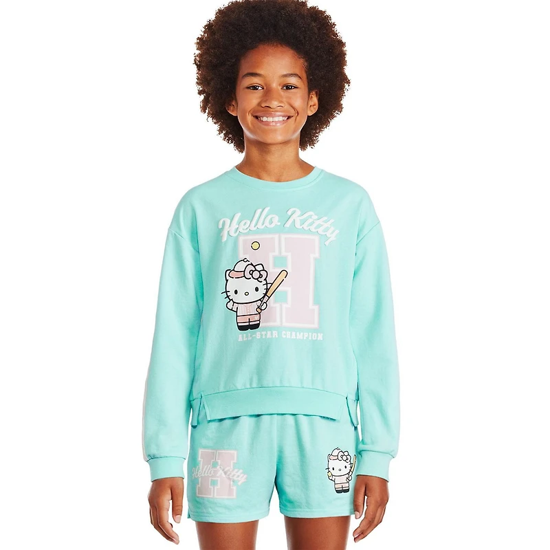 Add a sporty touch to her casual lineup with Hello Kitty girls’ graphic sweatshirt. It’s made of soft French terry for a comfy feel she can wear from school days to weekend downtime. The design includes a crew neck, long sleeves, dropped shoulders, front graphics, side taping, and small front slits for a relaxed finish. Pair it with leggings, joggers, shorts, or jeans for an easy everyday outfit.