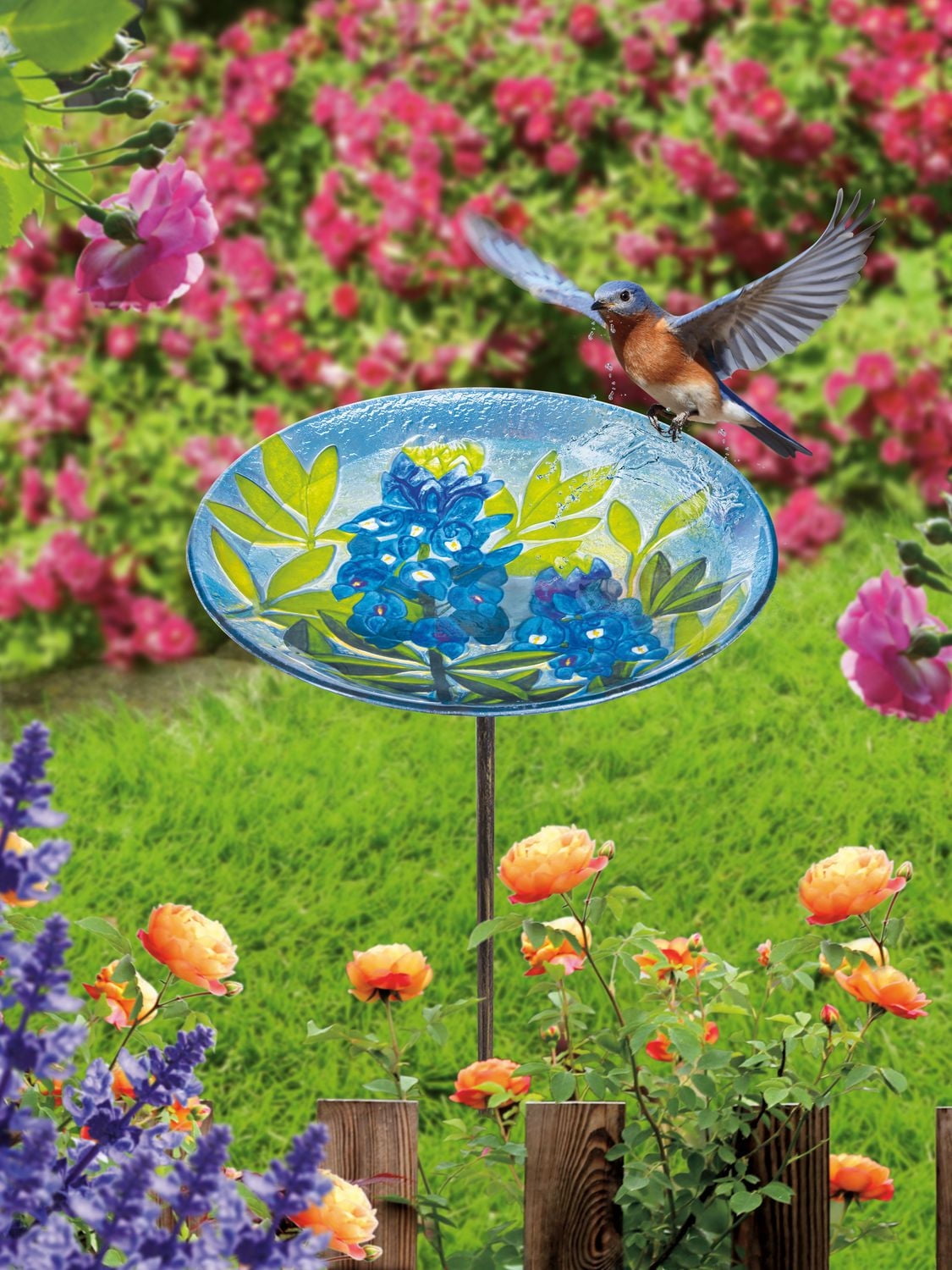 HOMETRENDS DELPHINIUM GLASS BIRD BATH ON STAKE