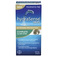 Whether your eyes are burning after a long day of staring at a computer screen or sensitive from a sunny afternoon spent outside, dry eye symptoms can be uncomfortable and often annoying. When your tears aren't lubricating your eyes properly you can experience sore, burning or stinging eyes, and this discomfort may affect your everyday life. Your eyes are important, and hydraSense Complete preservative-free eye drops for dry eyes can provide you with the symptom relief you are looking for. Dry eyes occur when the eyes either don't produce natural tears or when tears evaporate too quickly. These lubricating eye drops for dry eyes provide immediate comfort and intense relief from chronic dry eyes and offer extended protection from tough dry eye symptoms. These moisturizing eye drops for dry eyes contain a clinically proven, naturally sourced lubricant: sodium hyaluronate (0.15%) and naturally sourced ectoine (2%) that work by hydrating and moisturizing your eyes and help protect them from dryness by attracting and retaining moisture on the eye surface. hydraSense Complete eye drops provide relief from dry eye symptoms by offering fast and long-lasting hydration that is also gentle on your eyes. These lubricant eye drops feature an innovative sterile bottle with a built-in filter that allows for a completely preservative-free formula. The innovative bottle releases one drop at a time while the built-in filter keeps germs and bacteria out, thus preventing the solution in the bottle from getting contaminated. hydraSense Complete eye drops are also phosphate-free making them suitable for use with all types of contact lenses and the gentle formula is suitable even for sensitive eyes | Hydrasense Complete for Dry Eyes Drops Size 10ml
