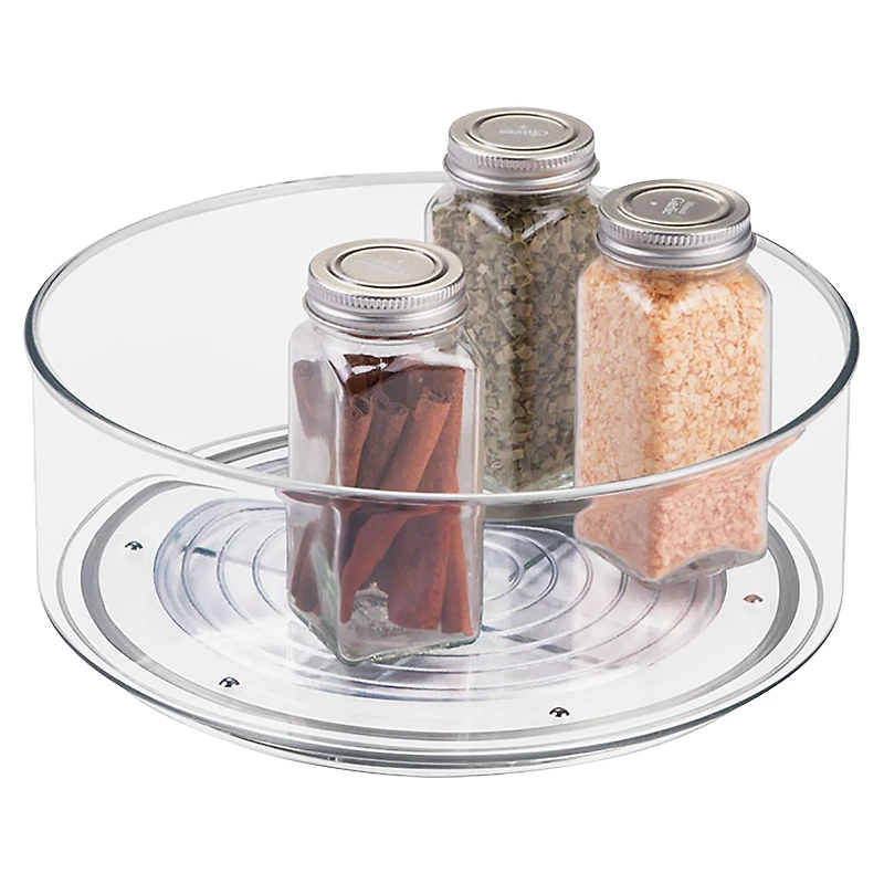 Lazy Susan turntable rotates for easy access. Great for organizing the kitchen countertop, cabinet, dining table or pantry. Stores spice bottles and jars, ingredient packets, tea bags, hot Cocoa packets and other baking or cooking essentials. Made of durable BPA-free plastic; Hand wash only | Interdesign Linus Turntable in Clear