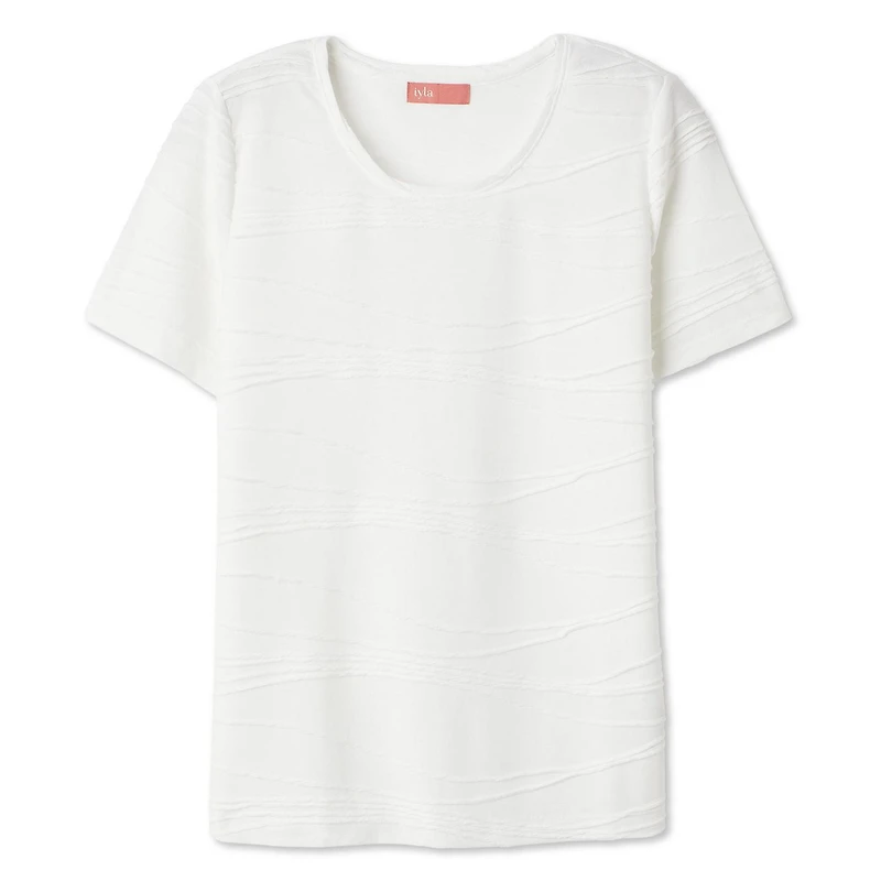 Add texture to your everyday rotation with Iyla women’s ripple T-shirt. Crafted from jacquard knit, it’s soft yet structured with a ripple design that sets it apart from a classic tee. The crew neck, short sleeves, and straight hem keep the fit timeless and versatile, while the textured finish brings an elevated aesthetic. Pair it with jeans, trousers, or skirts for an easy outfit upgrade.